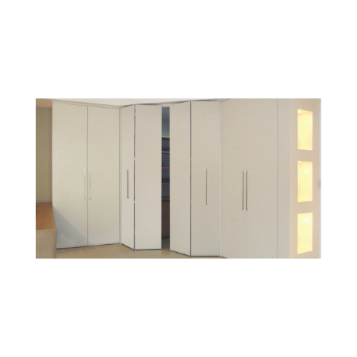Sistema corredizo colgante para puertas plegables de clóset, con costado abisagrado de bisagras de retén, que permite cubrir vanos de piso a cielo. Su montaje es sobrepuesto.